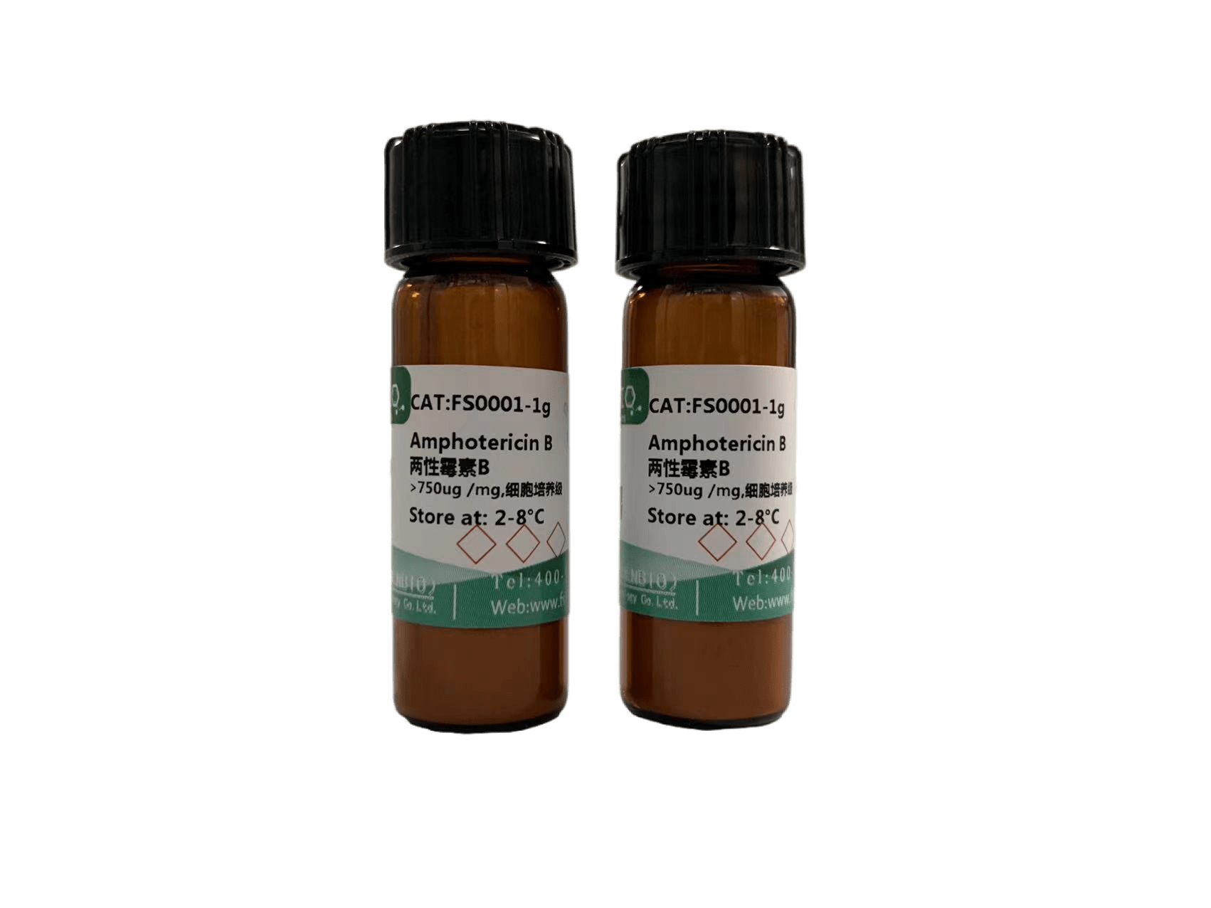 我司提供粉末形式的两性霉素B,细胞培养级别。我司还提供青霉素-链霉素-两性霉素B混合溶液(100×三抗),货号#FS0001-2一起用于细胞的维持培养,常用浓度为2.5µg/ml。对于已经受酵母菌和真菌污染的细胞,需在不含双抗的前提下,用2-4倍正常浓度(5-10µg/ml)的两性霉素B处理2-3代。一旦污染被控制,立即将作用浓度降到正常水平。