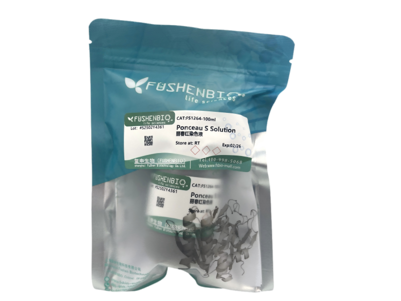 FUSHENBIO丽春红S染色液优点在于:1、染色可逆:染色后可以用蒸馏水、PBS或其它适当溶液冲洗至背景清晰后拍照,可以做后续实验,如ECL,Dot-ELISA等。2、使用方便、本底低、灵敏度较高、性能长期稳定、着色清晰灵敏、可检测250ng以上蛋白。