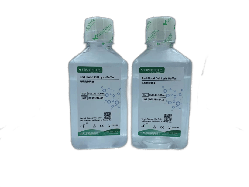 去除红细胞的方法有多种,Fushen生产的红细胞裂解液(Red Blood Cell Lysis Buffer),也称为Red Blood Cell Lysis Buffer,是一种从人鼠,或其他哺乳动物等体内的组织样品或血液中裂解并去除无核红细胞的溶液,其主要有效成分为氯化铵,Red Blood Cell Lysis Buffer经过优化配方,在裂解液无核红细胞的同时几乎不损伤淋巴细胞(Iymphocyte)或其他有细胞核的细胞