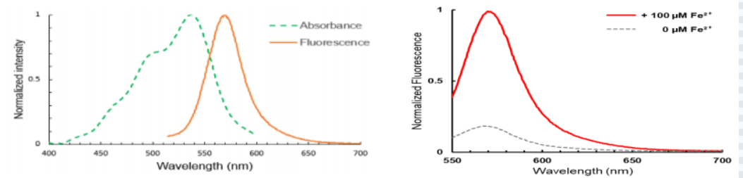 图1. FeRhoNox-1的光谱特征。FeRhoNox-1与Fe2+反应后吸收和发射光谱(上)。FeRhoNox-1在37℃,与Fe2+反应1h后,荧光明显增强。最大荧光峰约在575nm。