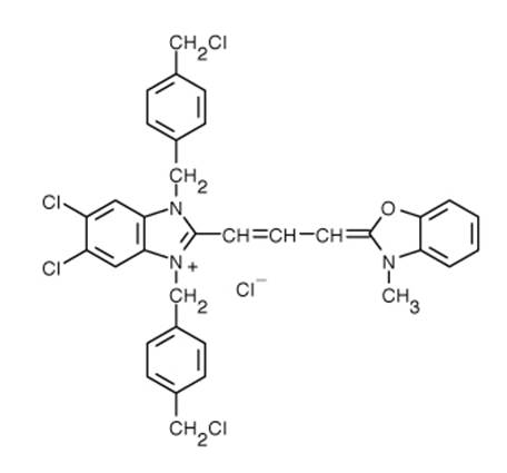 化学式:Benzoxazolium, 2-[3-[5,6-dichloro-1,3-bis[[4-(chloromethyl)phenyl]methyl]-1,3-dihydro-2H- benzimidazol-2-ylidene]-1-propenyl]-3-methyl-, chloride
