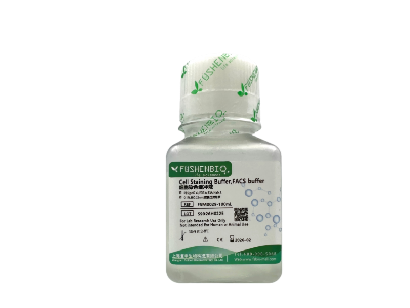 细胞染色缓冲液(Cell Staining Buffer)也称FACS buffer用于流式细胞检测细胞染色过程中细胞的洗涤及细胞浓度调节,也可用于抗体的稀释。主要成分为磷酸盐缓冲液(PBS),EDTA, 防腐剂和牛血清白蛋白(BSA),本产品含有EDTA,可以螯合金属阳离子,减少细胞之间的粘连,提高细胞悬液中单个细胞的比例。BSA作为一种蛋白存在于缓冲液中可以减少抗体的非特异性结合,防腐剂可以维持细胞表面抗原的稳定性。在防止溶液染菌同时,确保对细胞的影响降至可忽略的水平。配制溶液均经过无菌过滤处理并经过严格的质量控制。