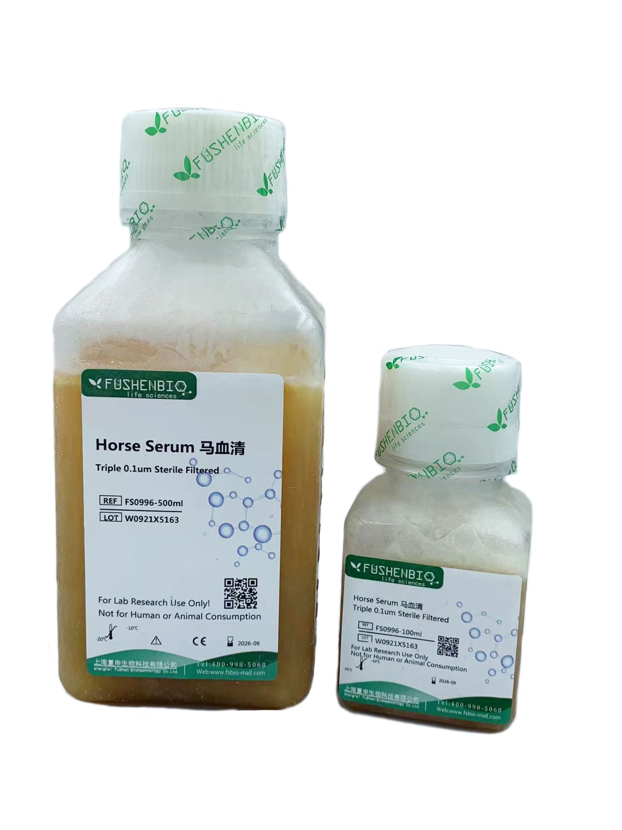 复申生物(FUSHENBIO)马血清采用健康马血液为原料,经无菌采集、分离、微孔过滤后而成,性状为澄清液体,无噬菌体、低内毒素,无溶血、无异物、无细菌、真菌支原体霉形体衣原体等,适用于试验室或生化科研相关试验,可用于较常规细胞培养,还适用于微生物培养及诊断试剂生产等。满足不同科研实验的多种需求。