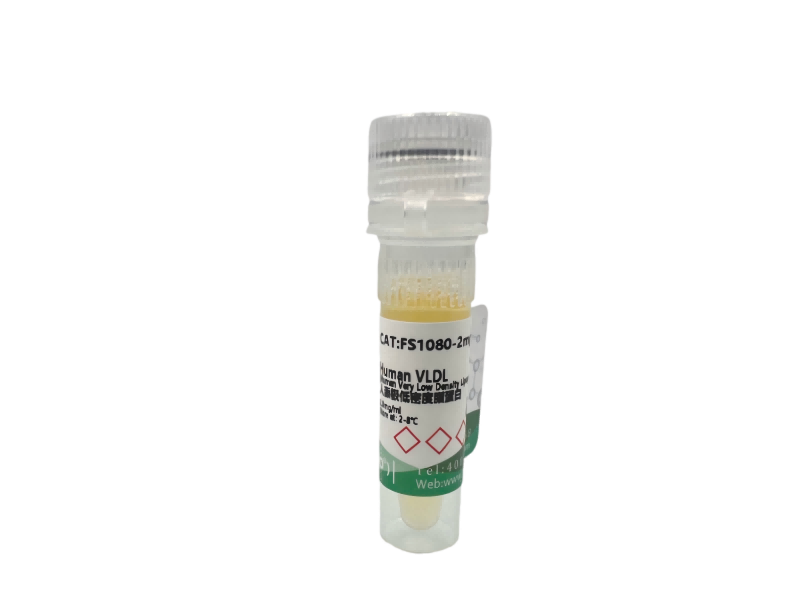人源极低密度脂蛋白(Human Very Low Density Lipoprotein(Human VLDL)),d≤1.006 g/mL,极低密度脂蛋白,是由肝脏利用乳糜颗粒残粒、胆汁酸、脂肪酸、糖和蛋白质的中间代谢物与肝脏内合成的载脂蛋白组成的一种脂蛋白。因其密度极低(0.96~1.063),分子大小为25~80NNL,内含含有甘油三酯、胆固醇、胆固醇酯和磷脂,甘油三酯(TG)占60%,胆固醇(TC)占20%,载脂蛋白占10%,其他成份10%。VLDL在肝脏合成,分泌后经静脉进入血液,再由VLDL内ApoCⅡ激活LPL,并水解其内的TG。由HDL的LCAT作用生成的。Human VLDL是脂肪酸的潜在来源,支持心肌细胞的能量代谢,用来研究极低密度脂蛋白受体(VLDLR)的代谢方式和生理功能,也常用来研究VLDL区分与乳糜微粒的生理效应。