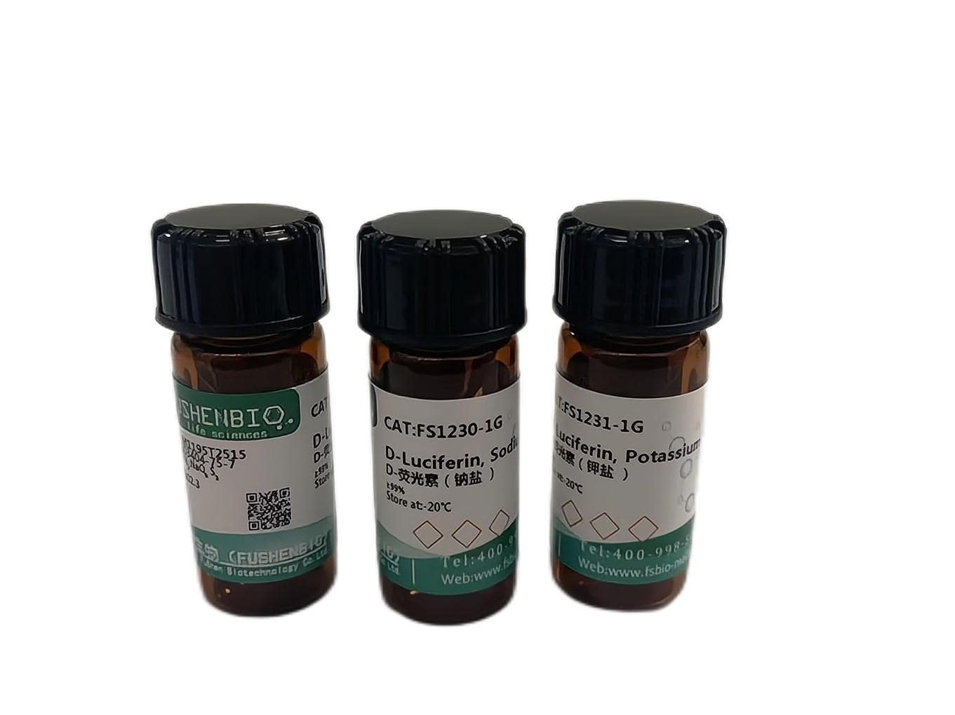 目前市场上有三种产品形式,D-荧光素(游离酸),D-荧光素(钠盐),和D-荧光素(钾盐)。这三种产品主要差别在于溶解特性。