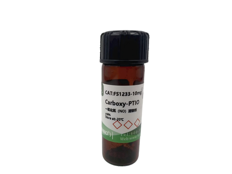 Carboxy-PTIO,常用的一氧化氮(NO)清除剂。一种水溶性且稳定的自由基,能以化学计量的方式与NO反应生成carboxy-PTI衍生物,同时产生亚硝酸盐或硝酸盐,起到NO清除作用。而carboxy-PTI衍生物反过来抑制一氧化氮合酶(NOS),抑制效率比同类抑制剂如NMMA或NOARG约强2倍。Carboxy-PTIO还可用于NO的电子顺磁共振(EPR)检测。研究显示,Carboxy-PTIO抑制乙酰胆碱诱导的大鼠主动脉环舒张效应,比L-NOARG活性强两倍。另外,经Carboxy-PTIO处理后产生的NO下游代谢产物,与单一的NO比较,抗病毒活性得以加强。NO代谢物具有重要的生理作用。