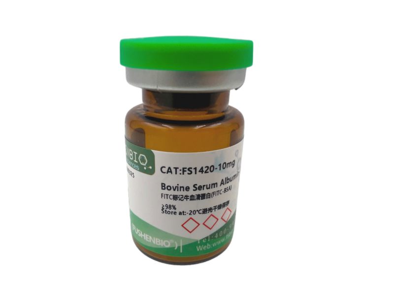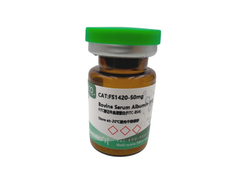 本品FITC标记牛血清白蛋白(FITC-BSA)是通过荧光素(通常是荧光素异硫氰酸酯,FITC)与牛血清白蛋白(BSA)偶联,制成的一种常用荧光探针。该标记分子常用于生物化学研究中的成像、蛋白质结合分析、细胞摄取实验以及药物递送等应用。BSA作为一种稳定的载体蛋白,广泛用于各种生物学实验,而荧光素的标记则提供了高灵敏度的检测手段。
