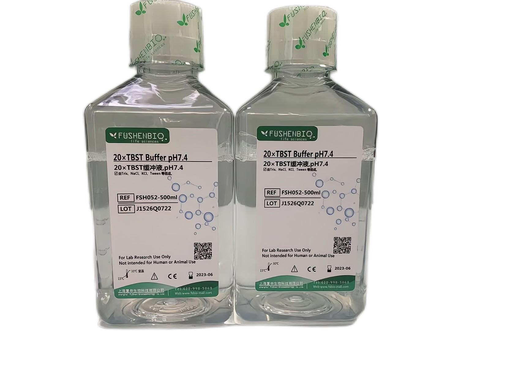 TBST 缓冲液是生物学中常使用的等渗缓冲盐溶液,主要用于 Western Blot 实验中洗去膜上非特异性结合 的抗体等试剂。由 Tris-HCl 构成稳定的 PH 缓冲体系,NaCl 提供等渗条件,Tween-20 作为去污剂可增加缓冲液 的洗脱能力。 本产品为 20×浓缩液,需要稀释成1×工作液后使用,用后请及时拧紧瓶盖,以防挥发。4℃保存可延长产品保质期,长期不 用建议低温保存。若产品出现结晶析出,请置于 37℃水浴至完全溶解。