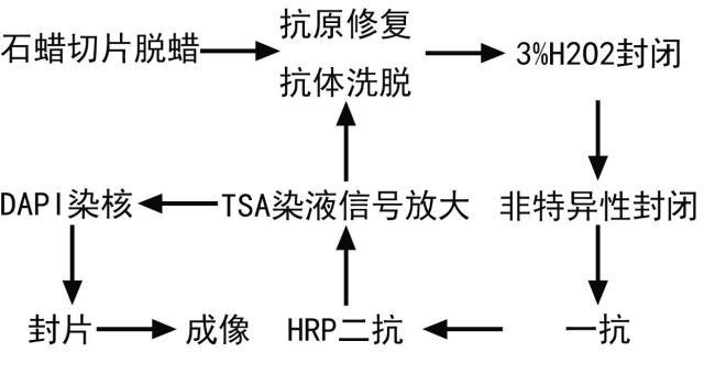 蛋白进行标记的酶学检测方法,类似常规免疫组化的DAB显色方法 ,TSA 技术同样采用HRP标记的二抗,同样有对应的“显色”步骤(HRP催化加入反应体系的酪胺荧光素底物,产生活化荧光底物,活化底物可与抗原上的酪氨酸等残基共价结合,使样品上稳定的共价结合酪胺荧光素。之后用热修复法或者抗体洗脱液洗去非共价结合的一抗-二抗-HRP复合物,重复下一种一抗-HRP二抗来第二轮孵育,换另一种酪胺荧光素底物,如此往复就可实现多重标记。
